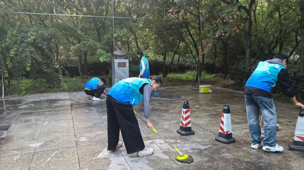 与此同时,另一组志愿者则投入到铜像周边小广场的清洁工作中。他们挥动扫帚,仔细清扫散落在广场地面和绿化带中的杂物;他们细心捡拾,确保每一个角落都恢复整洁。志愿者们全方位清扫与整理,营造出一个一尘不染的优美环境。整个劳动现场忙碌而有序,汗水与笑容交织,构成了一幅动人的校园风景画。