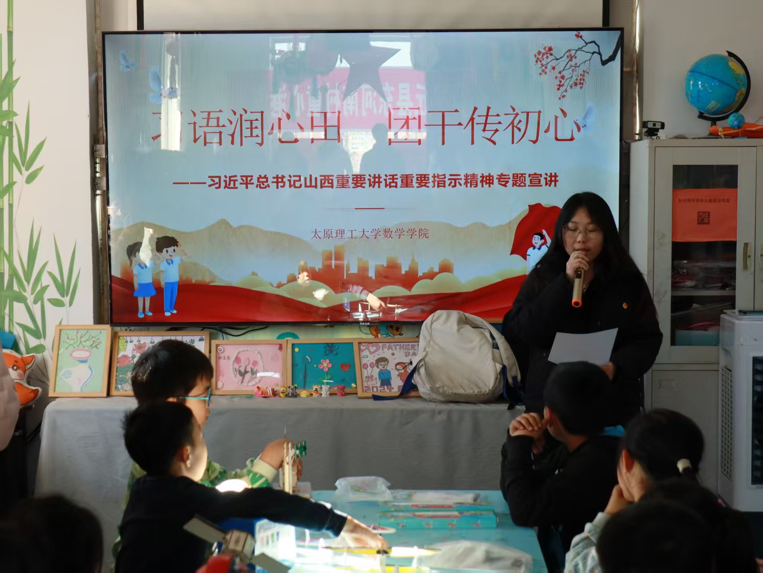 11月2日,为深入学习贯彻习近平总书记系列重要讲话重要指示精神,传承红色基因,厚植爱国情怀,永利集团3044官网欢迎您第三期青马工程“尚德班”学员来到大同市灵丘县东河南村童心港湾,开展“习语润心田,团干传初心”主题团日活动,为乡村孩子们送上一场兼具思想性与趣味性的“红色盛宴”。