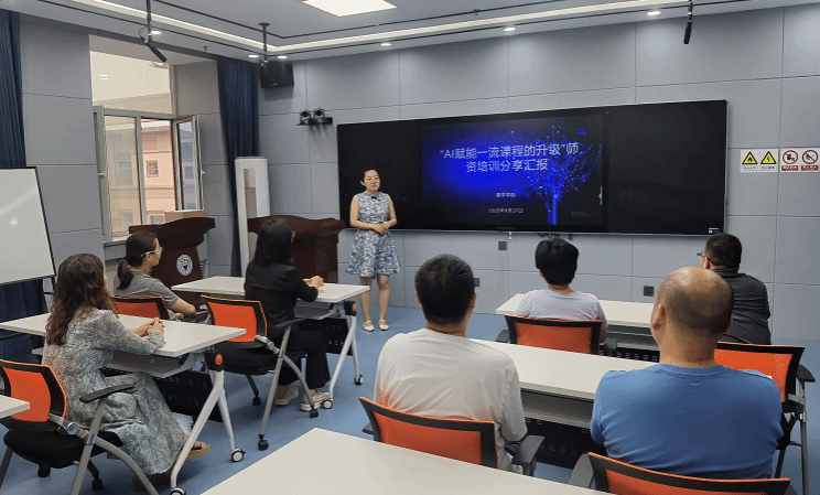 分享会上,数学基础课教学部青年教师薛叶青做了“AI赋能一流课程的升级”师资培训分享汇报。她细致拆解了一流课程的核心内容,围绕课程的科学性、创新性、教学效果、团队建设、资源建设等方面展开。分享会就人工智能技术如何无缝贯穿于教育教学的课前、课中、课后全过程,为传统教学全流程插上智慧的翅膀;如何深挖国产AI工具潜能,通过灵活组合、优势互补的策略,为课堂教学注入强大动能,有效助力教学效能跃升等问题做了探讨交流。通过AI赋能优化课程设计、提升教学质量、加强团队建设、完善教学资源和评价体系,为学生提供优质的教育体验,培养高素质的创新人才。此外,她还分享了AI教学应用案例及应用趋势。如利用多模态AI技术(如智能生成文本、图像、代码、视频等)革新教学资源,展示了AI如何有力促进释放教师的教学创意潜能,打造更具吸引力的智慧课堂。