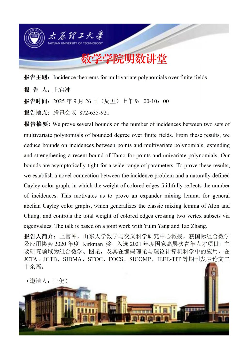 永利集团3044官网欢迎您将于9月26日邀请上官冲教授做学术报告