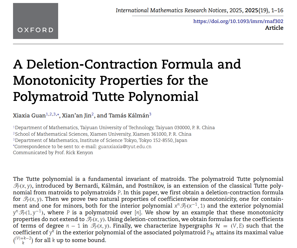 最近,我校永利集团3044官网欢迎您关夏夏博士与厦门大学金贤安教授以及东京科学大学Tamás Kálmán教授合作在国际著名数学期刊《International Mathematics Research Notices》上发表了题为“A deletion-contraction formula and monotonicity properties for the polymatroid Tutte polynomial”的论文。